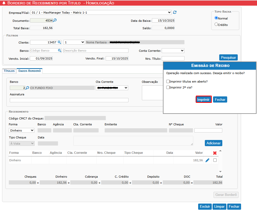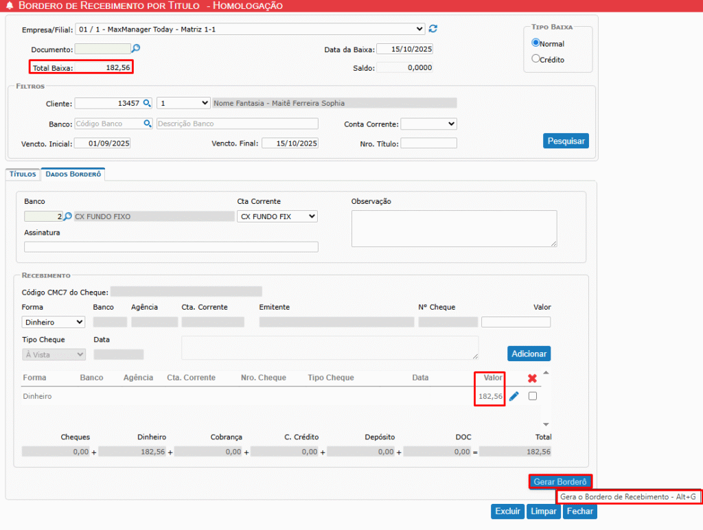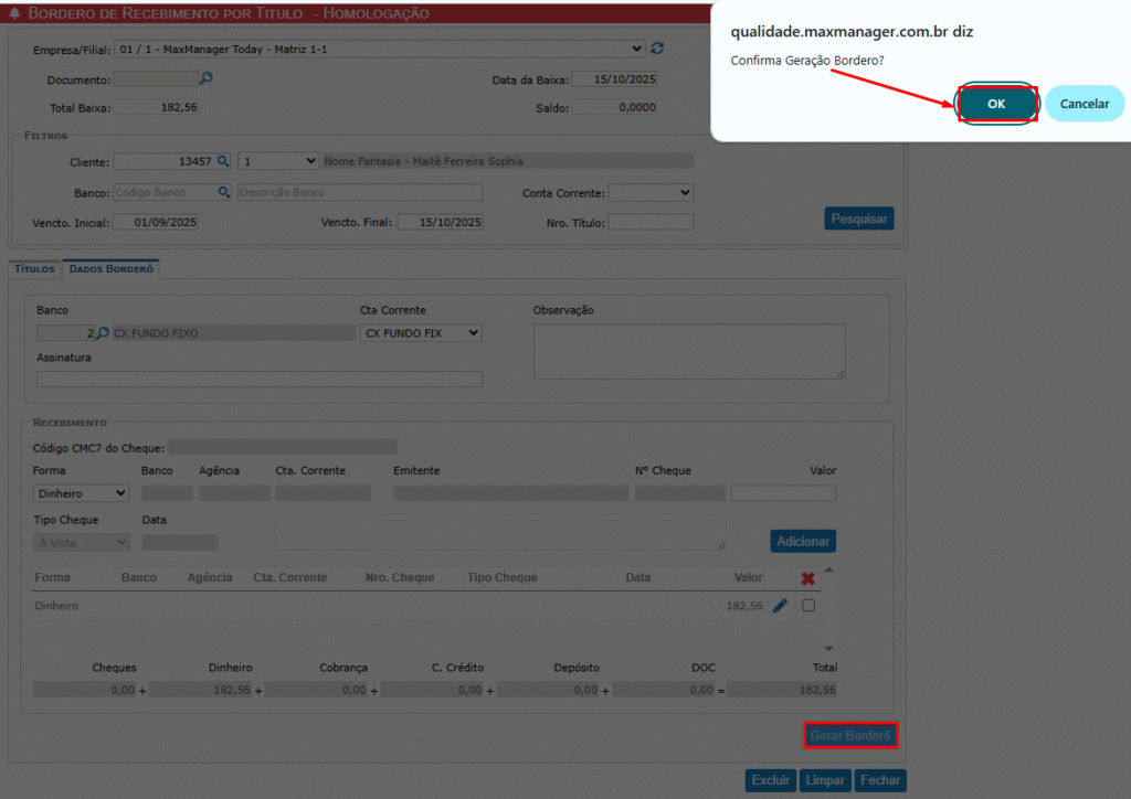 Após preencher todos os dados e a forma de recebimento, clique no botão Gerar Borderô.