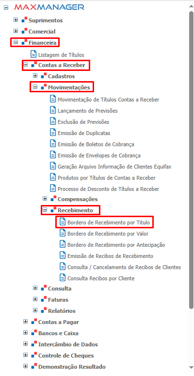 A rotina de Borderô de Recebimento por Título é utilizada para realizar a baixa manual de títulos a receber.
