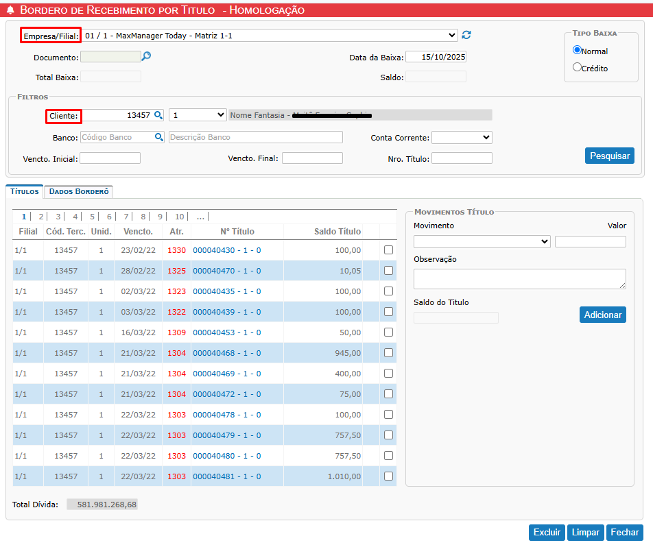 Ao acessar a tela, localize e informe a Empresa, Filial e o Cliente. Após a seleção do cliente, clique em Pesquisar para que os títulos em aberto sejam carregados e exibidos na grade.