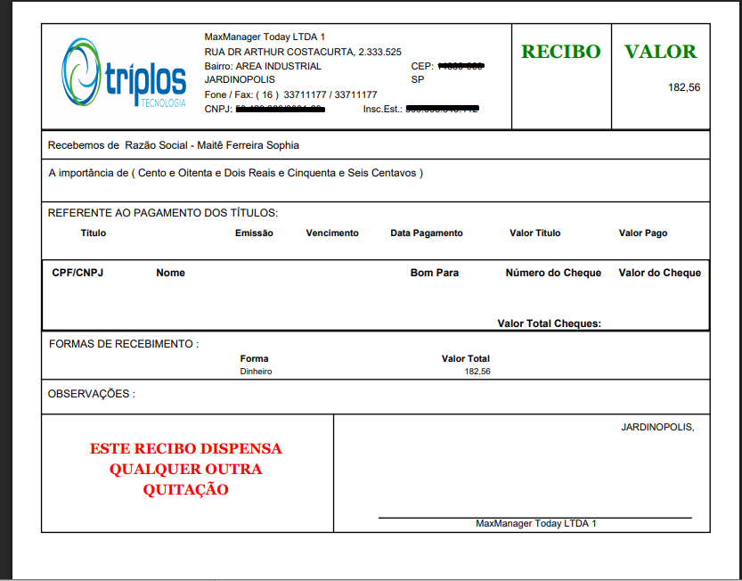 - Assinatura:Informe o nome da pessoa que assinará o recibo, caso haja a necessidade de impressão;