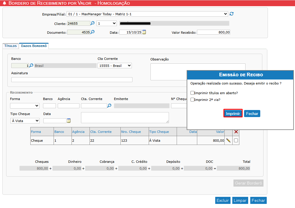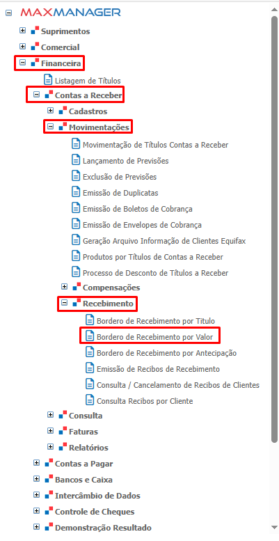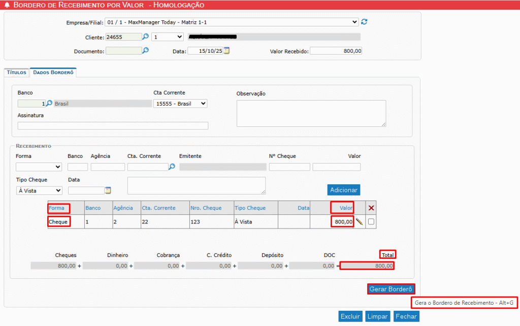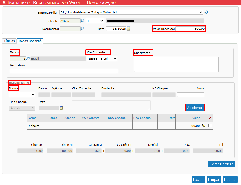 Ao acessar o menu acima e abrir a tela Bordero de Recebimento por Valor, poderá: