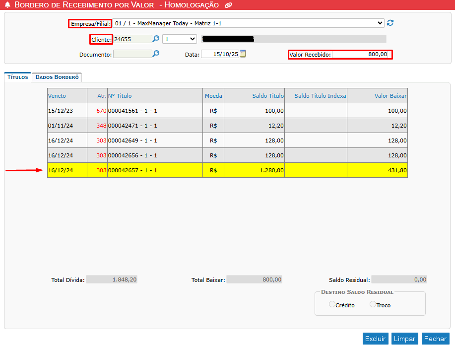 Observação sobre Baixa Parcial: O título em destaque (faixa amarela) indica que o Valor Recebido é insuficiente para sua liquidação total. Neste caso, o sistema realizará uma baixa parcial do título.