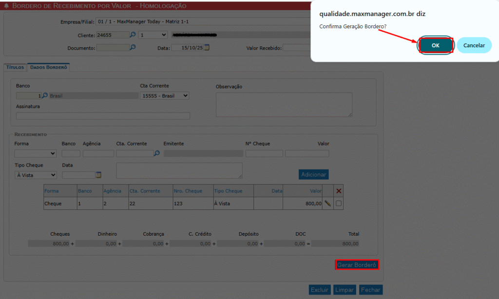 Após preencher todos os dados e a forma de recebimento, clique no botão Gerar Borderô.