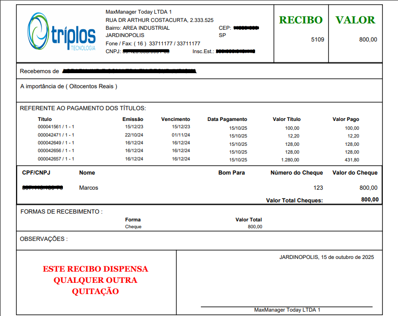 Funcionalidade: O recibo detalha a liquidação dos títulos, servindo como comprovante formal para o cliente.