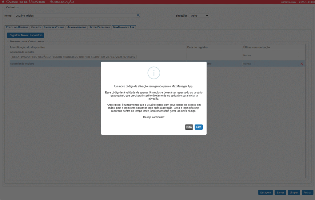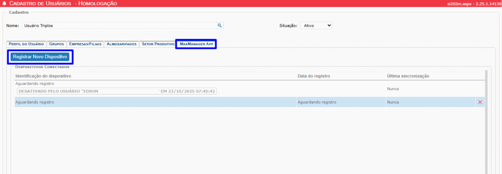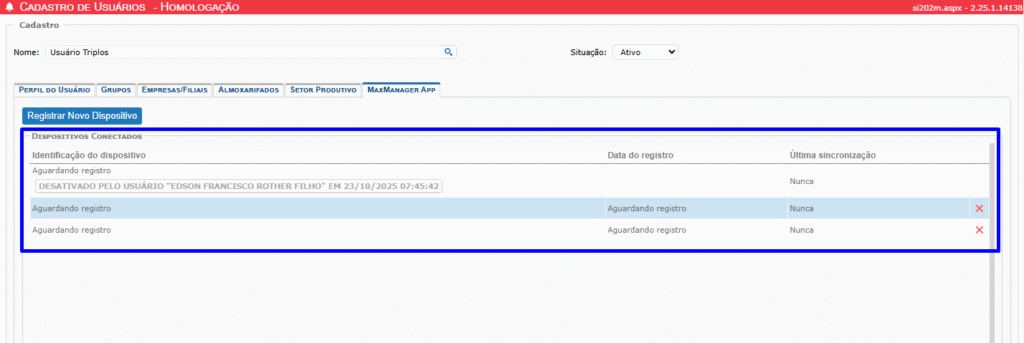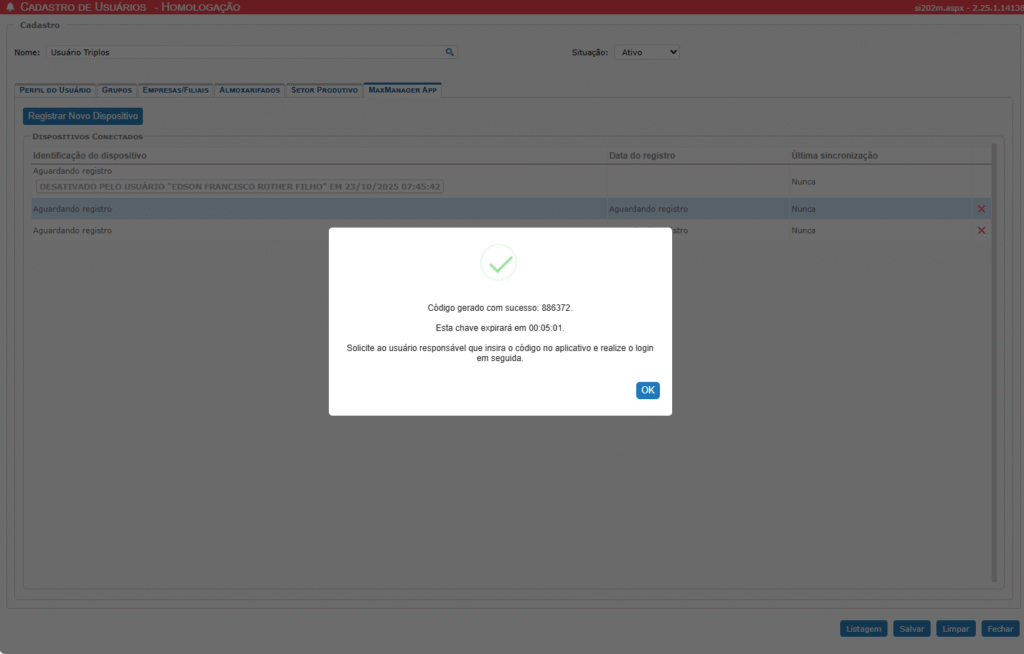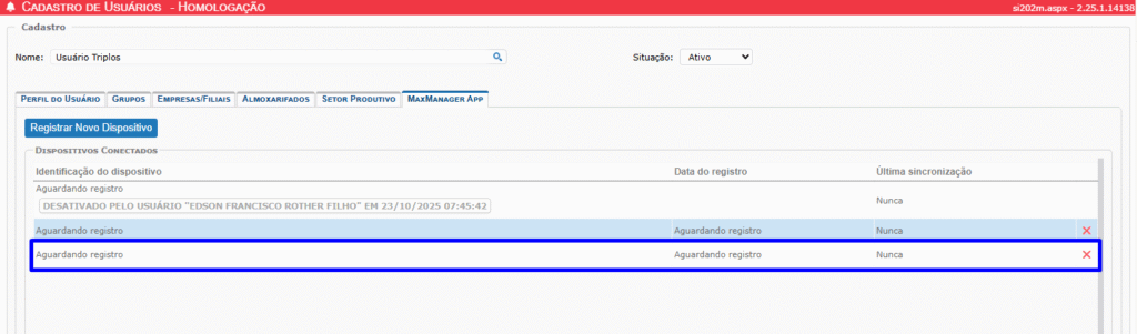 Note que foi adicionada uma nova linha na lista com o status “Aguardando registro”. Este registro permanecerá neste estado até que o usuário complete a ativação no dispositivo móvel.