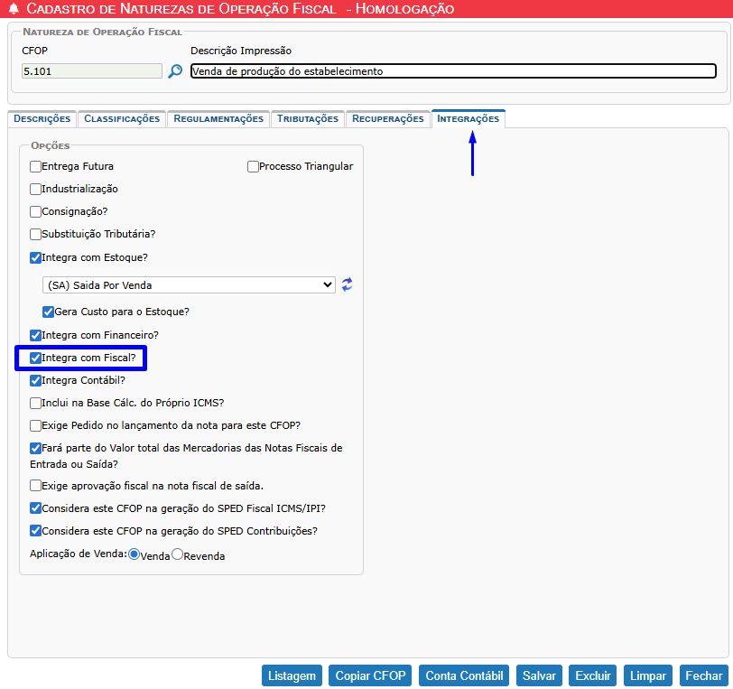 - Na aba Integrações, certifique-se de que a opção “Integra com Fiscal” está marcada.