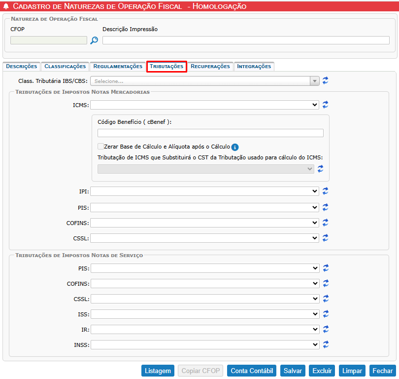 - Não utilize esta aba para CFOPs que não devem determinar a tributação do produto.