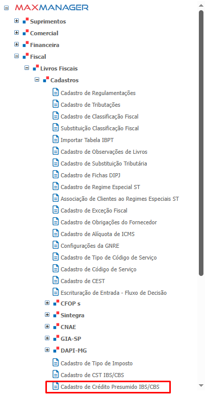 A partir da versão 2.25.1.14104 o Max Manager implementou a tela Cadastro de Crédito Presumido IBS/CBS, ajustes decorrentes da Reforma Tributária (Emenda Constitucional 132/2023 e suas regulamentações, como a Lei Complementar 214/2025).