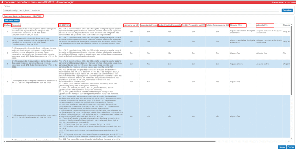- Filtro: Utilize a caixa de texto superior para pesquisar pelo Código, Descrição ou Artigo da LC 214/2025.