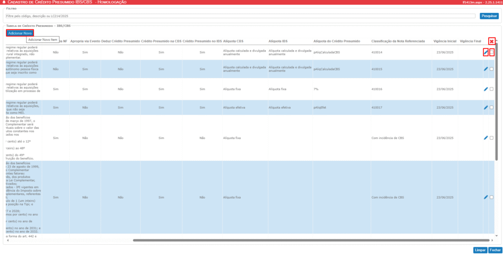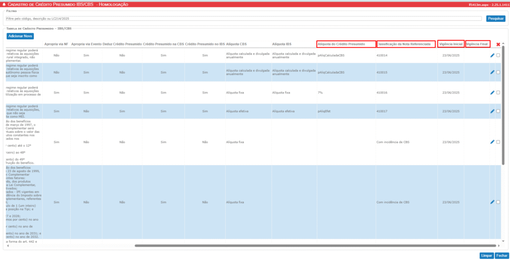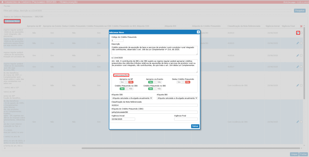 - Adicionar Novo: Botão para abrir o modal de inclusão e cadastrar uma nova regra de crédito presumido;