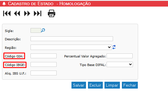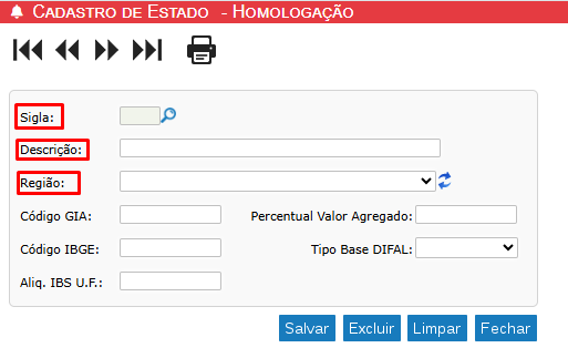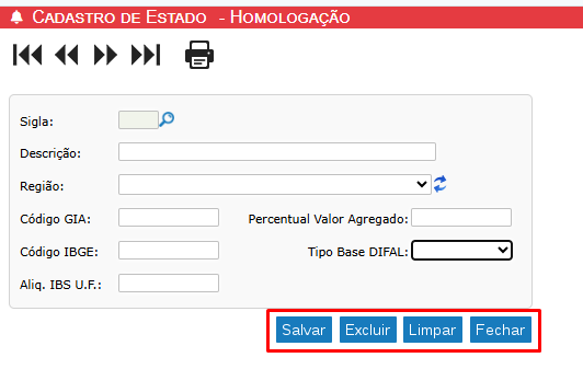 - Salvar: Confirma e armazena as informações preenchidas ou alteradas no cadastro do Estado.