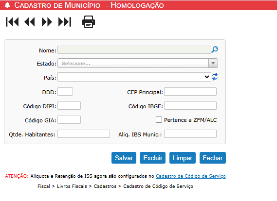 • Excluir > Remove o registro do município selecionado (sujeito a validações de dependência de dados).