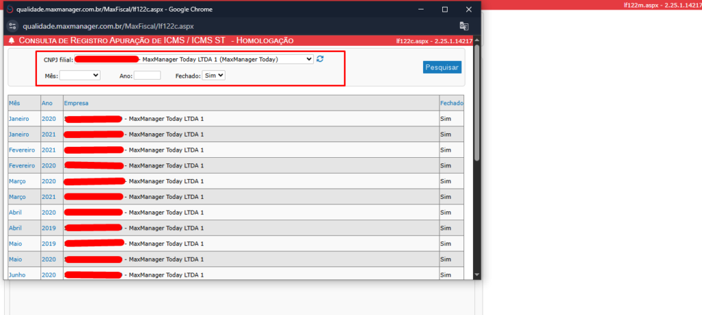 3- Na tela de Consulta que será aberta, localize o mês/ano referente a filial que deseja reabrir, veja que você pode utilizar os filtros pelo CNPJ, Mês, Ano e status da apuração;