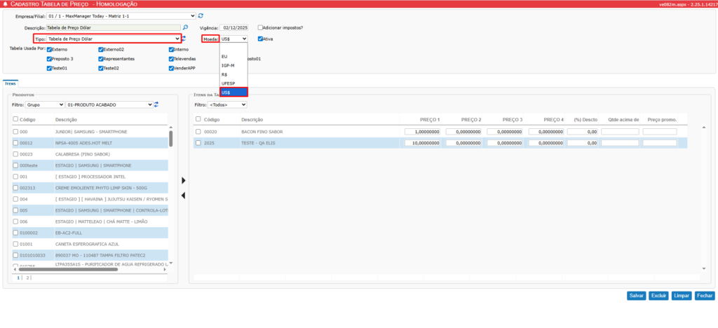- Lança os itens, que serão precificados automaticamente na moeda da tabela selecionada.