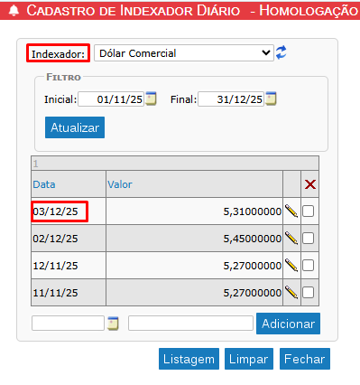 - Os preços dos itens nessa tabela devem refletir os valores na moeda estrangeira (USD, onde o usuário irá configurar conforme a moeda diária acessando o menu Sistema > Cadastros Gerais > Auxiliares > Cadastro de Indexador Diário (Imagem-2).