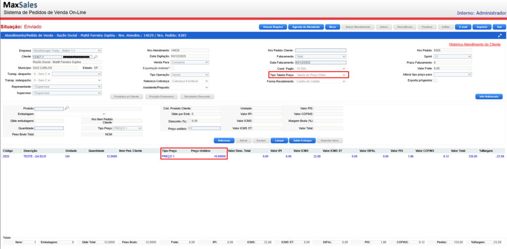 (Imagem-3) Pedido de Venda criado no Max Sales com tabela de Preço configurada na moeda Dólar (US$).