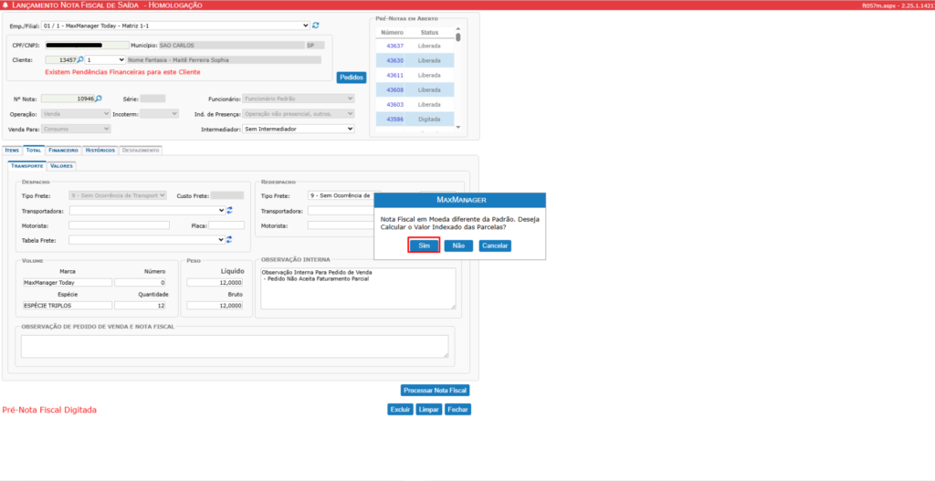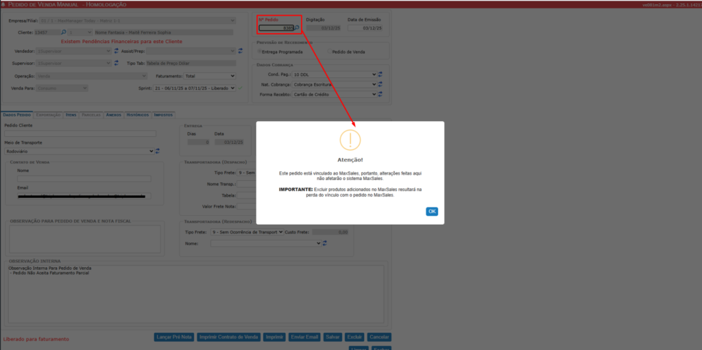 Seguindo com faturamento normalmente do Pedido de Venda dentro do ERP Max Manager – (Imagem – 6)