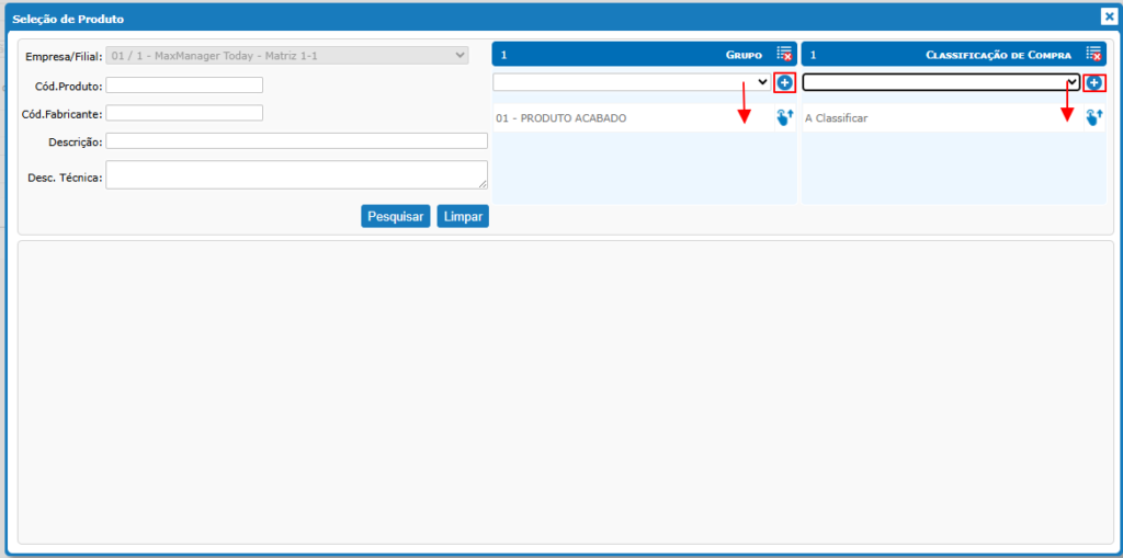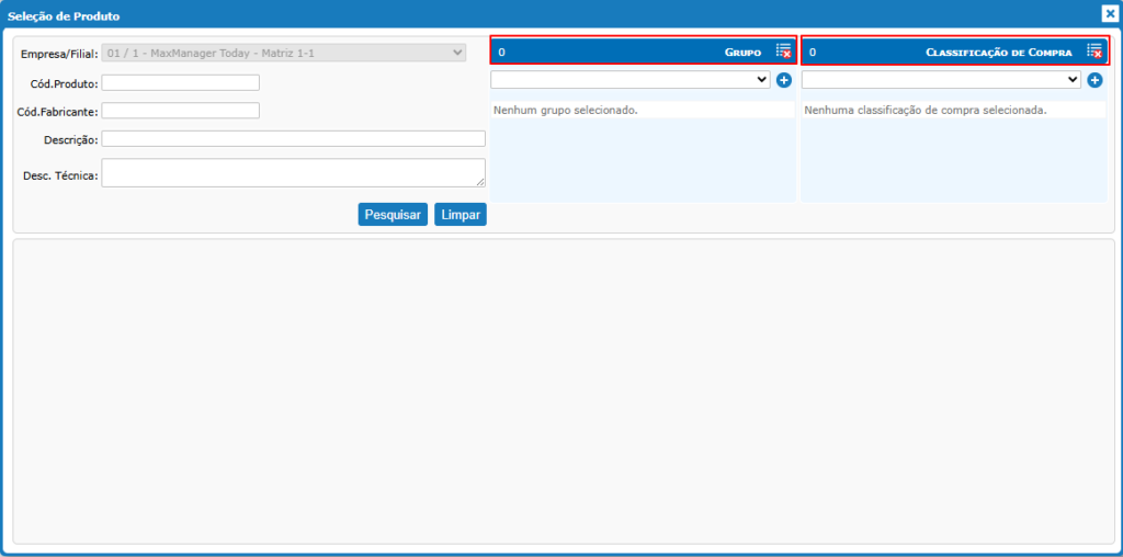 Ao abrir a tela de pesquisa, as áreas de pesquisa do grupo e da classificação de compras ficam recolhidas, para expandi-las, clique com o mouse sobre a faixa azul.