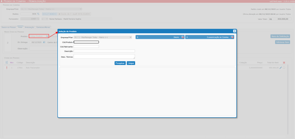 Na tela Pedido de Compra com um pedido de compra criado na tela principal ao clicar na lupa irá abrir o modal para a seleção de Produto.