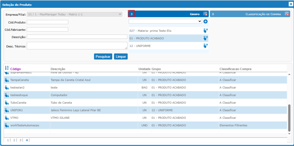 Além disso, a tela mostra quantos grupos estão sendo considerados no filtro, e ao pesquisar trazer todos os produtos cadastrados dentro do grupo ou classificação de compra filtrado.