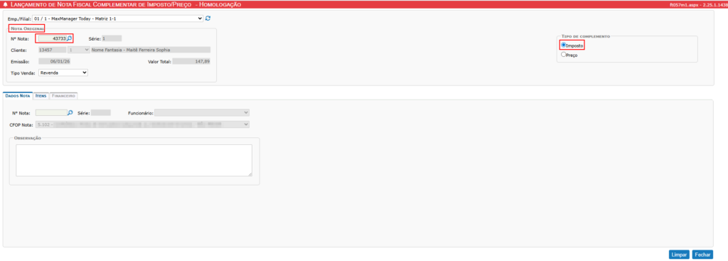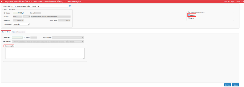 No MaxManager o processo para a geração de uma Nota Fiscal Complementar de Imposto assemelha-se tecnicamente à emissão da nota complementar de preço. No entanto, há um requisito crítico para garantir a conformidade da operação.