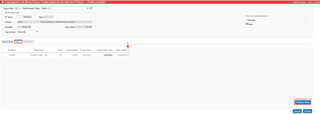 Selecione os itens que receberão o complemento de imposto ou preço e, em seguida, clique em Finalizar Nota Fiscal.
