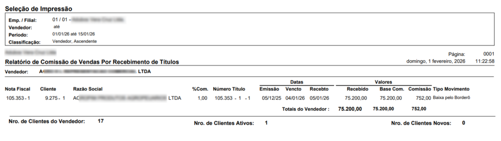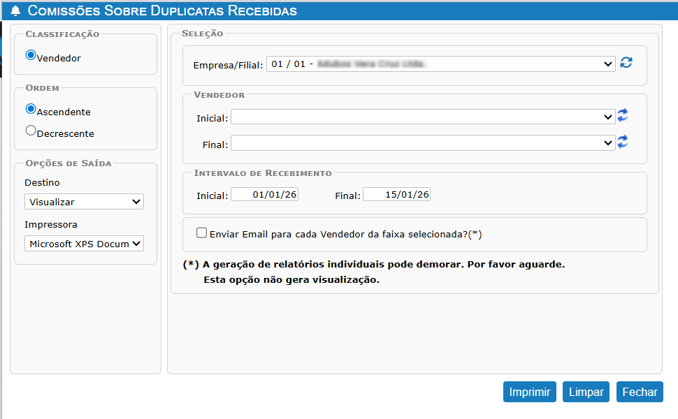 Suprimentos > Faturamento > Comissões > Relatórios > Comissões Sobre Duplicatas Recebidas