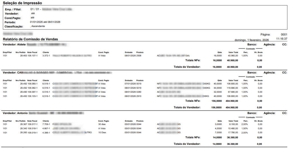 Suprimentos > Faturamento > Comissões > Relatórios > Relatório de Comissão de Vendas