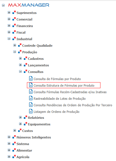 Caminho: Industrial > Produção > Consultas > Consulta Estrutura de Fórmulas por Produto.