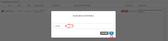 Tanto para aprovar como para rejeitar, após clicar no botão Processar, será solicitada a assinatura eletrônica do usuário aprovador.