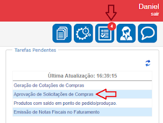 Ao posicionar o mouse sobre o ícone, será apresenta a lista de tarefas pendentes para o usuário, no caso, você deverá selecionar na lista, a opção de Aprovação de Solicitação de Compras.